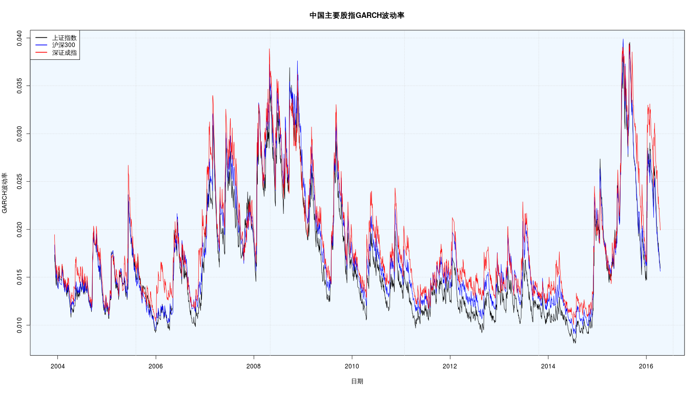xlab="日期", ylab="GARCH波动率", main="中国主要股指GARCH波动率")